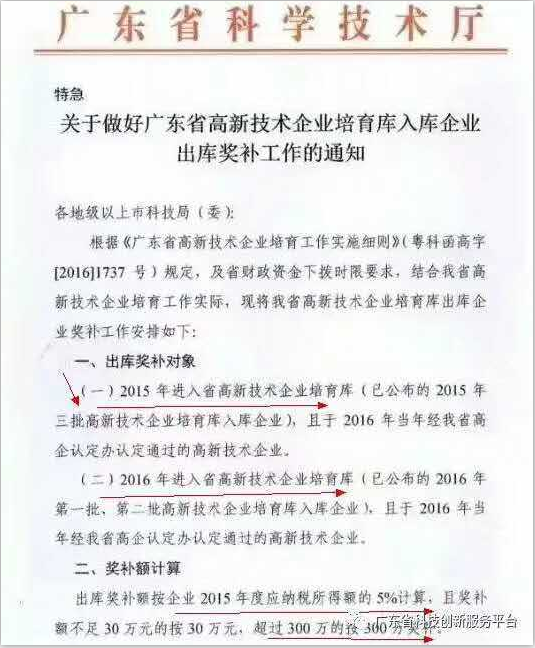 根据《广东省高新技术企业培育工作实施细则》规定,及省财政资金下拨时限要求,结合我省高新技术企业培育工作实际,现将我省高新技术企业培育库出库企业奖补工作安排如下: