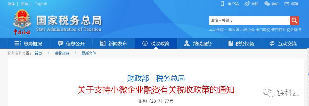 近日,财政部、国家税务总局发布《关于支持小微企业融资有关税收政策的通知》(财税〔2017〕77号),未来融资难、融资贵的状况有望得以缓解!