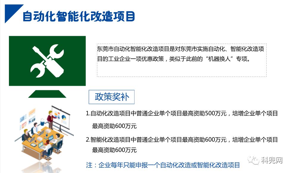 自动化智能化改造,即此前的“机器换人”。适逢2017年东莞市出台了新的自动化智能化实施政策,加之“机器换人”的巨额扶持,自动化智能化改造项目自然备受工业企业的欢迎!