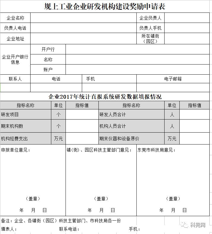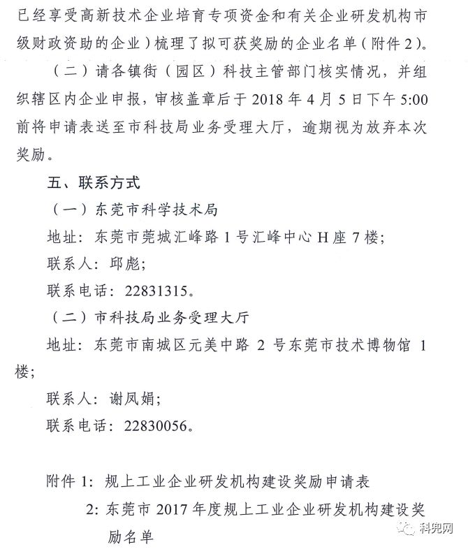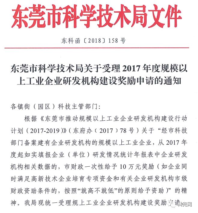 东莞市科学技术局关于受理2017年度规模以上工业企业研发机构建设奖励申请的通知