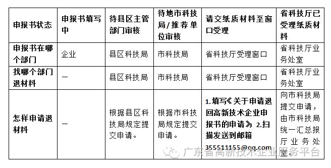 首先,企业需要根据系统中显示的申报书状态找到相应状态下申报书所在的科技管理部门,根据相应部门的要求提交申请退回的材料,具体要求参见下表: