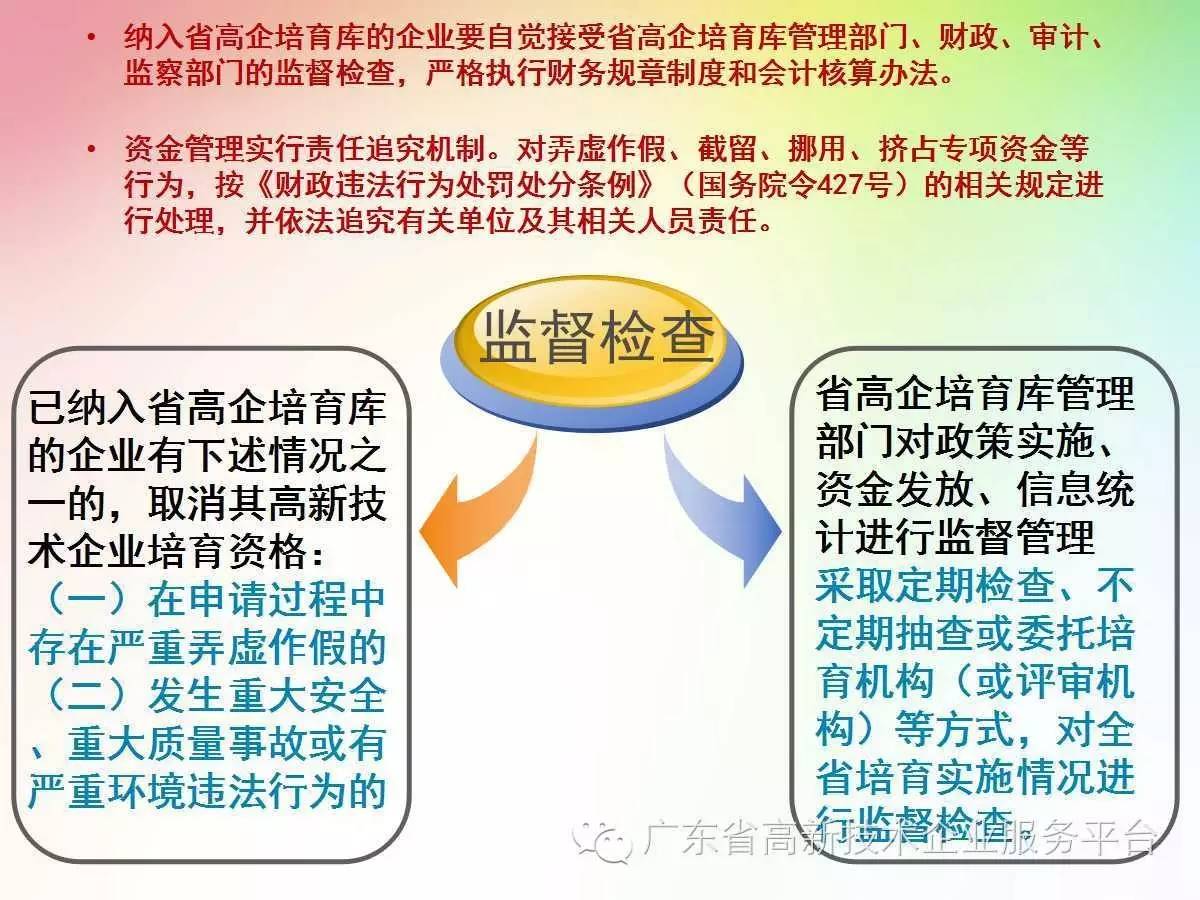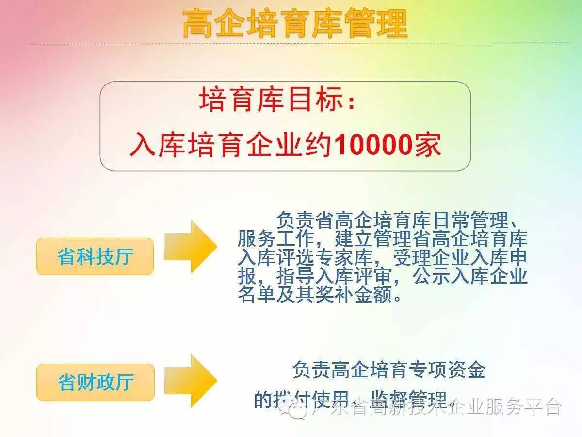 广东省科技厅、广东省财政厅结合今年国家修订的高企认定管理办法和高企认定工作指引,新修订并发布了《广东省高新技术企业培育工作实施细则》。依据该《实施细则》,省科技厅、省财政厅负责统筹全省高企培育工作,负责省高企培育库和省高企培育专项资金的管理,指导各地市高企培育机构建设和强化高企培育管理服务。