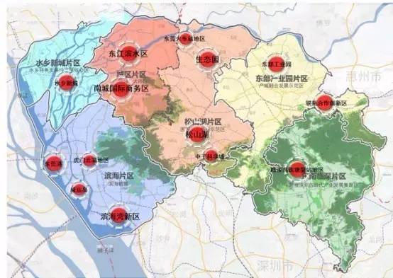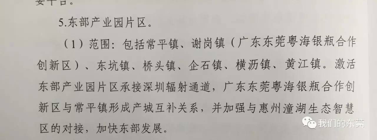 (解读:东部产业园片区,基础条件不错,在新的片区划分中,常平仍然发挥着重要的作用。位于谢岗的广东东莞粤海银瓶合作创新区总投资数百亿,加上承接深圳辐射,发展可期。)
