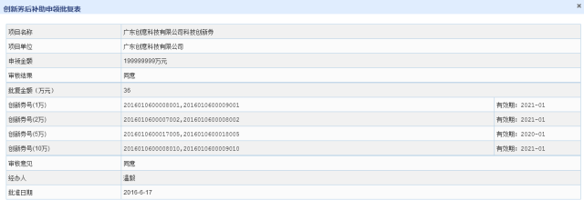 点击操作列的“批复结果查看”可查看创新券批复结果详情。