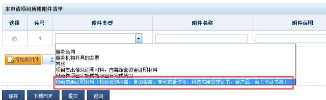 附件类型中“[创新成果证明材料(检验检测报告,查询报告,专利或著作权,科技成果鉴定证书,新产品、新工艺证书等)]”(下图2)必须上传。