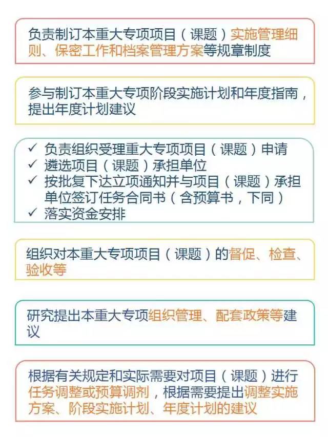 重大专项项目(课题)的具体管理工作原则上委托专业机构承担。三部门会同牵头组织单位等提出备选专业机构建议,由部际联席会议审议确定。尚未委托专业机构的重大专项,其职责由专项实施管理办公室承担。
